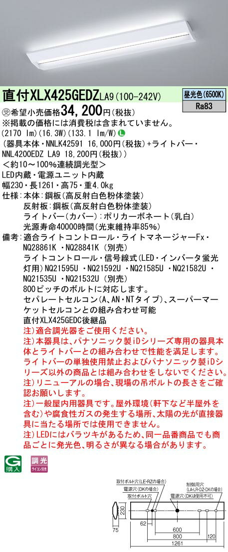 【最安値挑戦中!最大34倍】パナソニック XLX425GEDZLA9 一体型LEDベースライト 学校用 天井直付型 40形 連続調光型・調光(ライコン別売) 昼光色 受注生産品 [∽§]