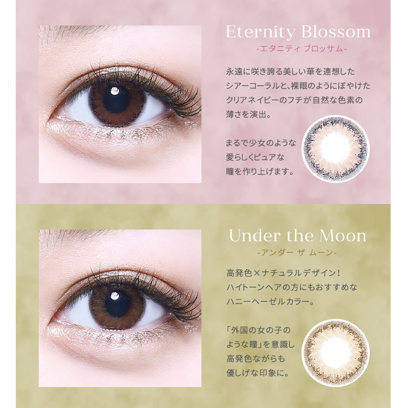 製品情報 ・高度管理医療機器承認番号:22400BZX00253000 ・含水率:38.0% ・レンズ直径 14.5mm/コケティッシュブラウン、トワイライトヘーゼル 14.2mm/エタニティブロッサム、アンダーザムーン、ミスティックフォレスト、スモーキークォーツ、ウォータリーカーネリアン、イノセントアクアマリン、アーバンヴァージナルアッシュ、アーバンコケティッシュブラウン ・レンズ:BC8.6mm ・度数:±0.00〜 -8.00 ・使用期限:1ヶ月 ・1箱の枚数:1枚 ・販売元:M.Iジャパン株式会社 ・製造販売元:M.Iジャパン株式会社 ・製造国:韓国 ・使用目的再使用可能な視力補正用色付コンタクトレンズ ・商品区分:高度管理医療機器 ・展開カラー:エタニティブロッサム アンダーザムーン ミスティックフォレスト コケティッシュブラウン トワイライトヘーゼル スモーキークォーツ ウォータリーカーネリアン イノセントアクアマリン アーバンヴァージナルアッシュ アーバンコケティッシュブラウン 使用上の注意 ・必ず眼科医の検査/処方を受け、ご自身の目にあったコンタクトレンズをお求めください。